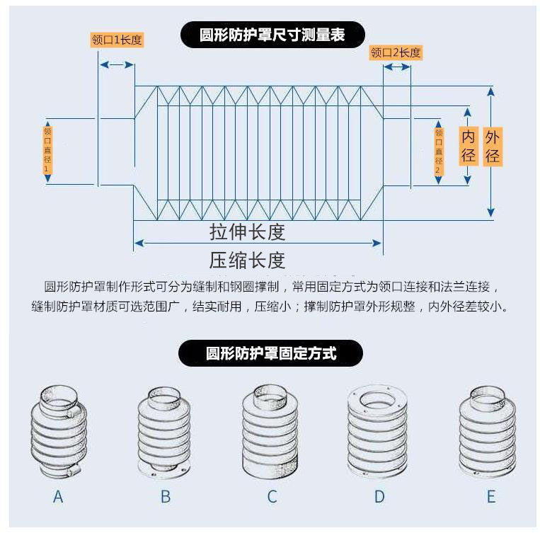 另一種就是縫制絲杠防護(hù)罩,圓形絲杠防護(hù)罩是經(jīng)沖壓的圓片縫制成,相臨的兩個(gè)內(nèi)邊,兩個(gè)外邊縫合在一起,通過縫制就可以達(dá)到比較好的外形穩(wěn)定及水平方向上的牢固。材料可根據(jù)工作環(huán)境的不同有多種選擇。